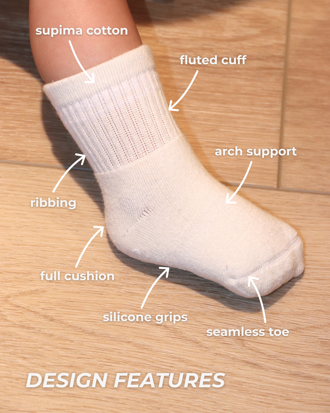 From sourcing high quality, clean materials to tweaking the smallest stitch, we meticulously developed a sock worthy enough to keep your baby's piggies supported, warm, comfortable, and safe.